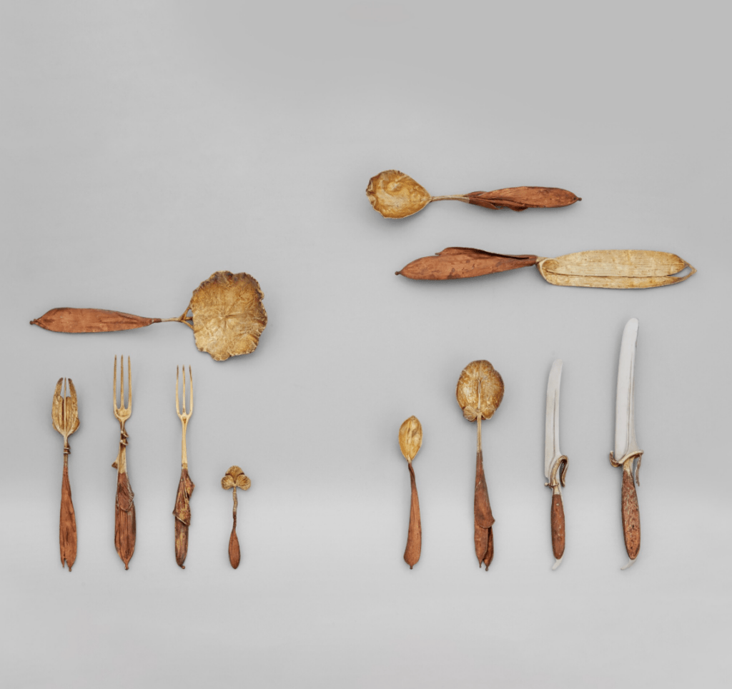 Ici, point de couverts disciplinés alignés comme des soldats suisses. Chaque pièce semble avoir décidé, avec un calme très parisien, de ne pas tout à fait rentrer dans le rang. Une cuillère qui s’étire, une fourchette qui hésite entre feuille et métal : l’objet murmure qu’il a mieux à faire que d’obéir.